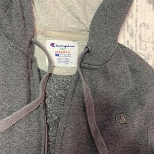 Charcoal Champion hoodie with full zipper. Includes drawstring hood and side pockets.