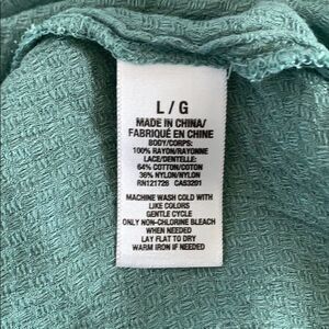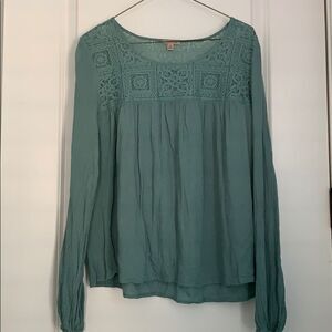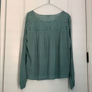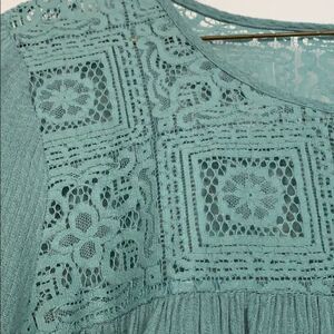 Mint green long sleeves shirt. Has a lace pattern in the top chest portion on the front and back.
