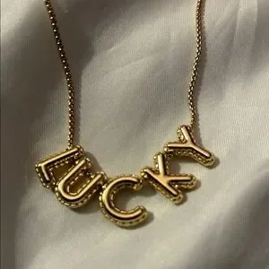 * 16” gold tone necklace with a 2” extender with Balloon Letters that spell LUCKY. This comes from the Kate Spade Collaboration with