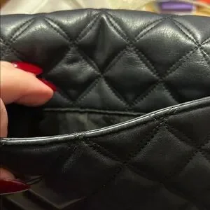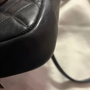 * Quilted Natalia Navy Blue Diamond Shape quilted exterior and all black on black interior. Flap closure onto a front turnlock which has been tarnished due to usage. The bag is approx 8x5” with a 22” shoulder drop. 3.5 inch silver chain on each end of strap. Back pocket on rear for extra room.