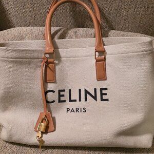 CELINE Horizontal Cabas Tote Hand Bag, Canvas Calf Skin, White, DISCONTINUED