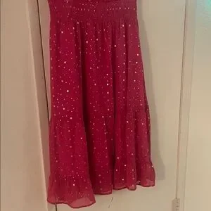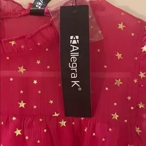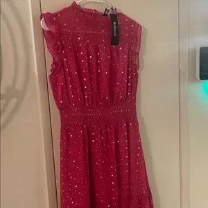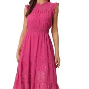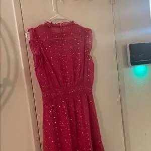 This fuchsia midi dress with metallic stars by Allegra K will put all eyes on you. Its gorgeous chiffon fabric is lightweight. The stylish details such as the ruffled cap sleeves and neckline and keyhole back make it perfect for special occasions. It’s new with tags in a women’s size small.