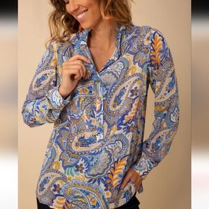Elevate your style with this vibrant paisley print top. Featuring a stunning blend of blue and yellow, this top is perfect for any occasion. Enjoy the comfort and elegance it brings to your wardrobe.