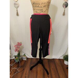 This product is a pair of women's athletic capri pants in size M, featuring a stylish black and pink color combination. The pull-on closure makes them easy to put on and take off, while the polyester and spandex material offers comfort and flexibility. Perfect for workwear, these pants can be machine washed for easy care. The capri style adds a trendy touch to this versatile garment, ideal for everyday wear.