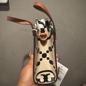 Elegant small tote featuring iconic Tory Burch design. Black and cream pattern with brown leather handles.