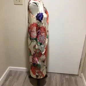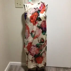 Laviniaturra draped floral hydrangea print dress. Silky polyester with lining, front drapes. Beautiful hydrangea floral print. Size 42 / US medium. A2