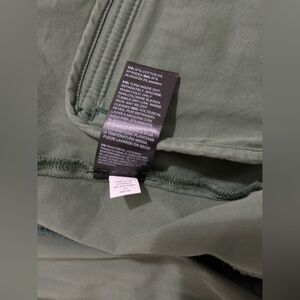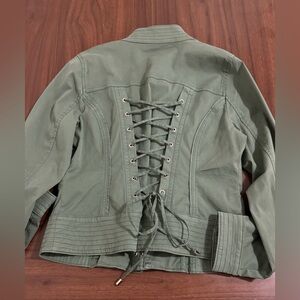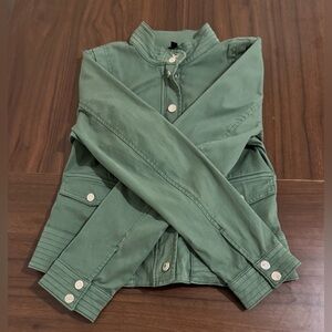 Chic olive utility jacket with button accents. Features a high collar and front pockets.