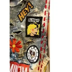 HAND PAINTED, DISTRESSED, HAND STITCHING DETAILING, VINTAGE ROCK AND ROLL T-SHIRT CUT-OUT INSERT.