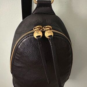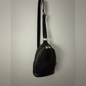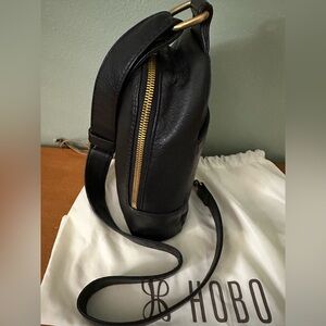 Hobo Fern Black Pebbled Leather Sling Bag. Dimension: H: 8.5: W: 6.5: D:2.5” Old English brass hardware, sandalwood lining, exterior slip pocket, interior zip pocket. Includes Dustbag. In good pre owned condition.