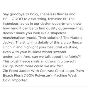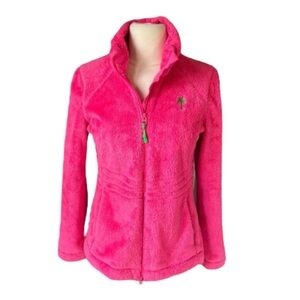 This is a Lilly Pulitzer bright pink fleece jacket, size XS. It is in great condition, no stains. Look at the close up to see the vibrant bright green zipper pull and Lilly logo. This is a slim fit jacket with fun stitched detailed at waist. There are two zipper hand pockets.