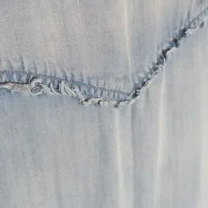 Casual denim shirt dress. Button-down front. Long sleeves with cuffs. Frayed hem for a relaxed look.