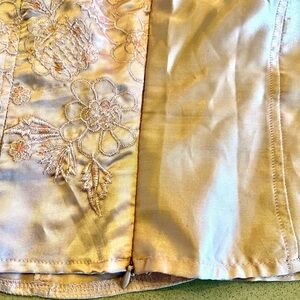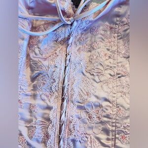 Size Medium see pics for approximate measurements lace up front side zipper adjustable straps embroidered flower patter with some sequin detail extra sequins packet still attached along with tags never worn in great condition especially for vintage has been hanging out in my closet & needs to go to a concert, renaissance fair, festival, date night, night out … something fun