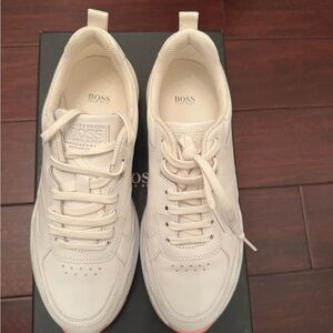Stylish cream sneakers by Hugo Boss. Features a unique pink sole. Perfect for casual wear, new never worn