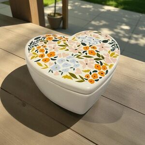 This charming heart-shaped ceramic box features a vibrant floral design. Perfect for adding a touch of elegance to any room.