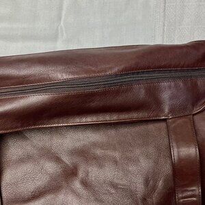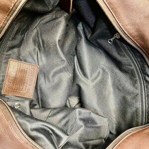 On offer is this huge tote bag in soft supple leather by Coach. Dark Brown. 19 inches wide and 15 inches tall (plus handles) Thinner leather makes this bag feel oh so luxurious. Very sturdily constructed with the handles integrated with the bag's body. This bag does have a fabric lining and a leather top closed with a long vinyl zipper. Made in Italy!