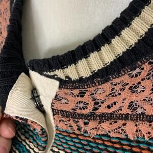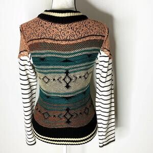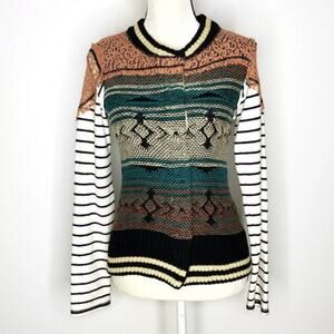 G By BKE Size S Striped Knit & Lace Snap Front Cardigan Colorful Boho Tribal. Condition is Pre-owned. No rips or holes. Small faint blue spot at one wrist as shown so please see all photos.