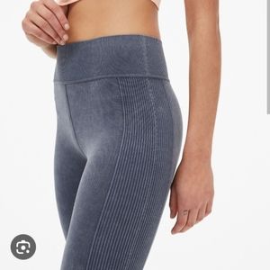 Lovely denim-blue high stretch leggings. Super comfortable, mid-high rise, 7/8 length. Unique ribbing pattern down the sides of the legs curving toward the calves.