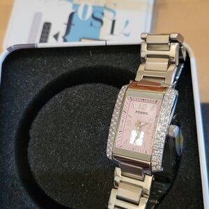 Elegant Fossil watch in silver with crystal accents. Rectangular pink pearl face with silver stainless steel details. This watch has never been worn & is new with original tags & tin box.