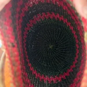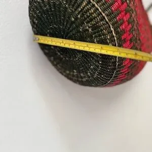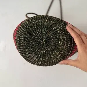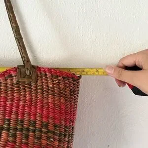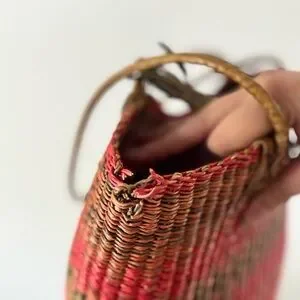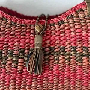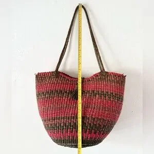 Stylish and spacious, this handwoven tote bag features a beautiful pink and brown pattern. Perfect for everyday use, it combines fashion with functionality. Breaks in the top rim at either side due to creasing but otherwise in beautiful condition.