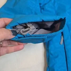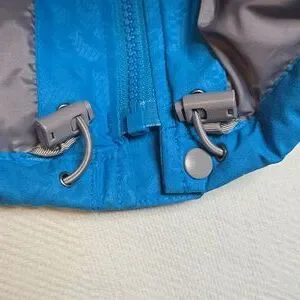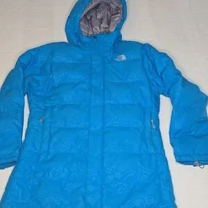Super warm North Face Heatseeker jacket. Bright blue color. Well loved but in great shape. zip closure, velcro, and top/bottom snaps. zip pockets, velcro adjustable sleeves (at wrist). clips for gloves.
