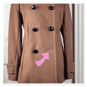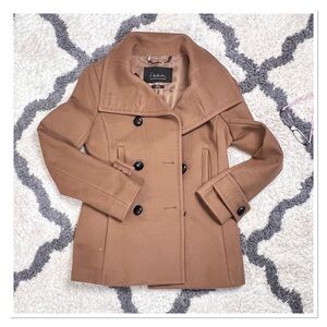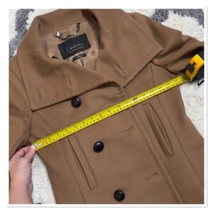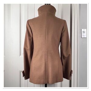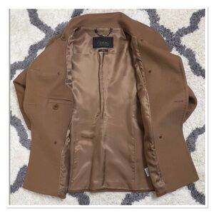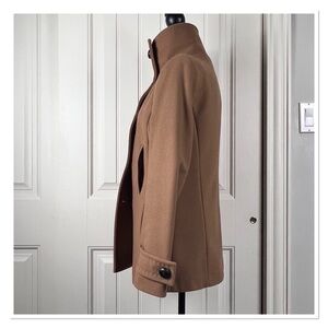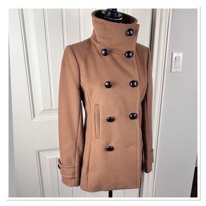 Chic double-breasted design. High collar for added warmth. Ideal for versatile styling. Warm, wool & cashmere blend.