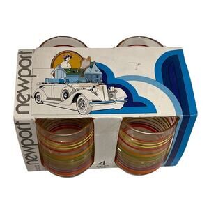 Vintage set of 4 Anchor Hocking Newport striped juice glasses in their original packaging. These 7 oz glasses feature bold retro stripes in yellow, orange, red, and green — perfect for a mid-century modern or kitschy kitchen aesthetic.