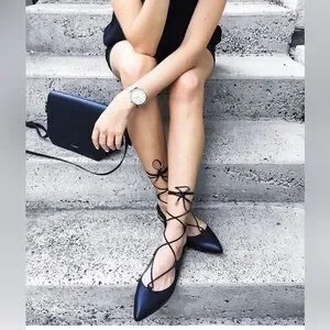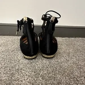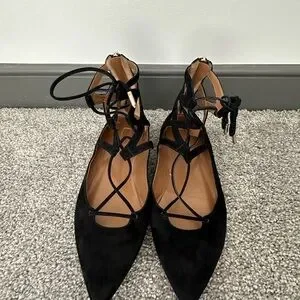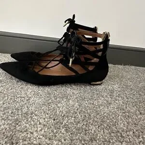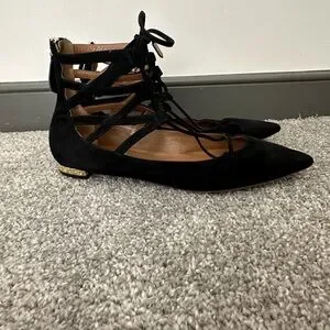 Authentic Aquazzura Iconic Flats, lace-up, metallic heel, lightly padded leather insole, black leather, gold tone hardware, made in Italy, good condition