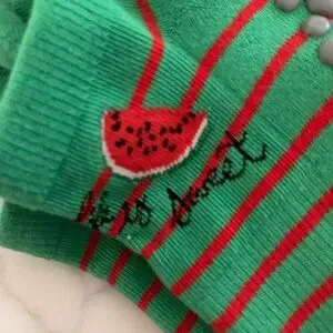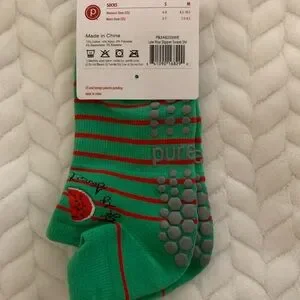 Green grips socks with red stripes. Pure Barre branding on the side. Little watermelon on the side. Comfortable and trendy.