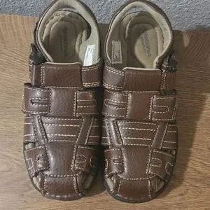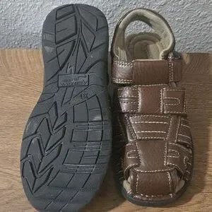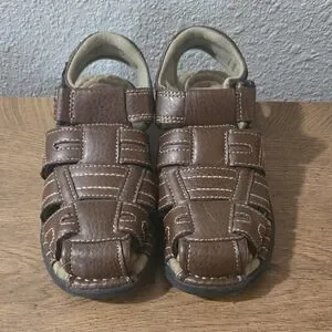 Durable brown sandals with secure straps. Perfect for active play. Used once