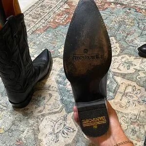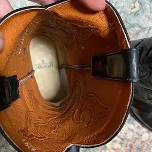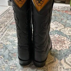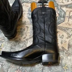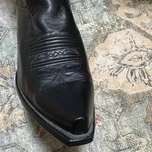 Elegant black leather boots with intricate stitching. Perfect for a stylish look.