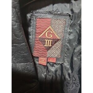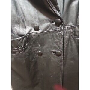 This vintage G-III double-breasted black leather trench coat for women in size large features a classic 80s and 90s style. The long coat made of leather with a nylon lining is suitable for travel, casual, and business occasions. With button closure, long sleeves, and pockets, this stylish jacket is perfect for the winter, fall, and spring seasons. Made in Indonesia, this trench coat is a timeless addition to any wardrobe.