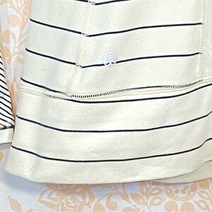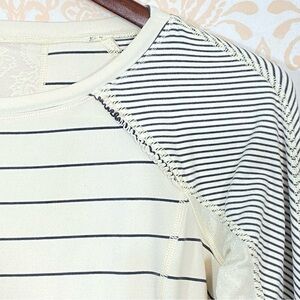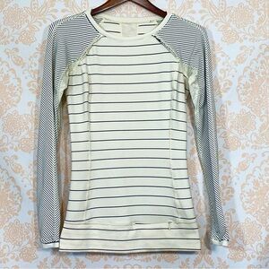 EUC Lululemon Full Tilt Slalom Stripe long sleeve top 6 in cream and gray. It's all in the details; adorable lace details abound. Ruffled lace detail on angled shoulder seams and sheer lace inserts on the underarms and down the back set this top apart from the rest! Hidden zippered pocket lower left front hem. Thumbholes in sleeves. Reflective inserts in sleeve cuffs. Super soft, four way stretch, moisture wicking fabric. Flat stitch hems. Lululemon logo left hip in rear. Approx flat lay measurements: shoulders 18", bust 16.5"