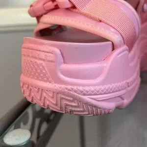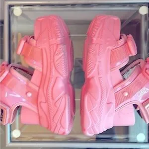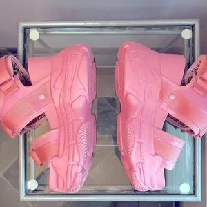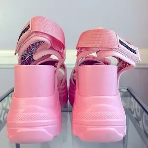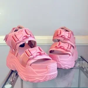 Anthony Wang pink platform buckle sandals with adjustable Velcro strap.