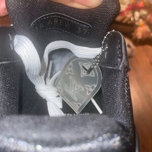 Elegant Louis Vuitton sneakers. Black leather with white laces. Iconic LV logo detail.