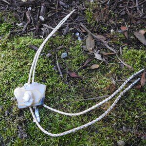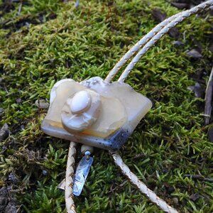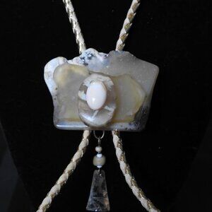 This unique necklace is a beautiful piece of handmade artisan jewelry. The pendant is crafted with bone material and features a stunning Moss Agate and Mexican Opal stone. The bolo closure adds a touch of Western style to the piece, making it a perfect addition to any wardrobe. The necklace is signed and has an adjustable chain type for a comfortable fit. The pendant shape is misc and the color of the stones is cream, white, and beige. This necklace is perfect for those who appreciate beauty, nature, and art. It is also a great piece for those who believe in luck, bohemian, healing, retro, ethnic, fashion, and costumes. This vintage necklace is made in Mexico and has one gemstone.