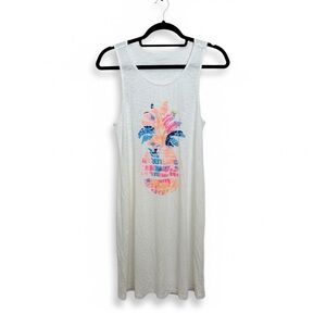 Stylish mini dress featuring a colorful pineapple print. Ideal for warm weather. Perfect for a swim coverup. Size medium. No flaws