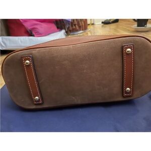 Chic suede satchel with leather trim. Features sturdy handles and signature logo detail.