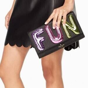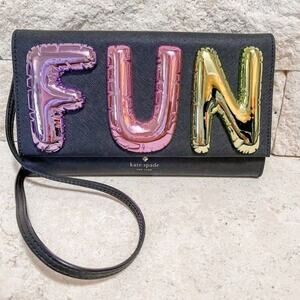 Kate Spade Whimsies Collection Fun Balloon Clutch in Black Multi. Features metallic letters that spell 'fun,' magnetic flap closure, interior zip pocket, three card slots, lined, saffiano leather, attached strap can be tucked in for clutch carrying. Leather. Style PXRU7322. Excellent condition, no flaws.