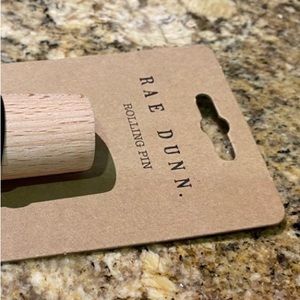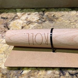 Long wood rolling pin with “ROLL” etched in wood in signature Rae Dunn lettering