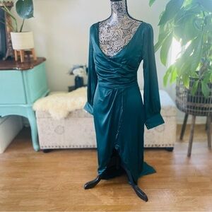 🏷️ 4/$25 Satin Deep-V Long Sleeve Faux Wrap Maxi Dress in Deep Teal Green Small