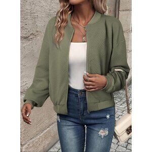 This lightweight women's bomber jacket in army green is perfect for fall casual wear. It has a flattering, short fit that moves with you, making it ideal for layering or wearing on its own.