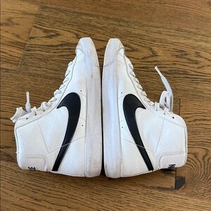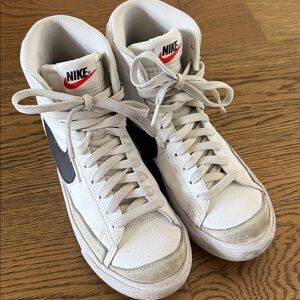 Elevate your look with these Nike high-tops. White with gray accents. Stylish and comfortable for everyday wear. Unisex. Big kid size 6Y