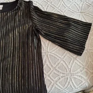 Step out in style with this elegant black and gold striped dress. Perfect for any occasion, this dress combines sophistication with a touch of glamour.