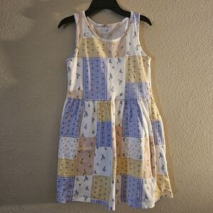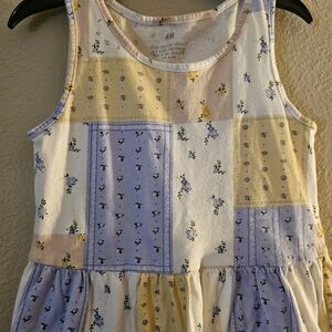 Charming H&M dress with patchwork design. Features lavender, mustard, and ivory squares. Perfect for casual wear.