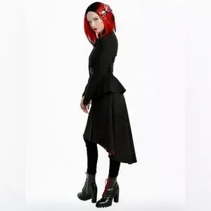 You might just lose your head over this hi-low jacket from the limited edition Hot Topic Alice Through The Looking Glass collection. Inspired by the Red Queen's battle armor, this jacket features her symbol on the back waist, ruffled collar, corset lacing at the waist and faux leather paneling. Snap and zipper closure.