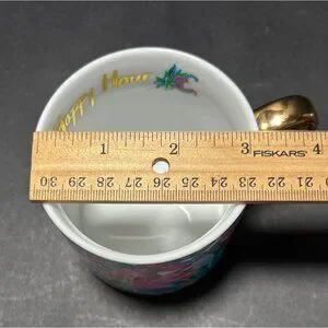 Bright and vibrant ceramic mug featuring colorful floral print and gold tone handle. "Happy Hour" script on inside rim. Hand wash only. Made in China.