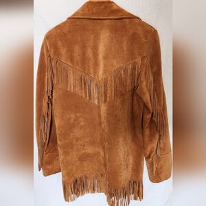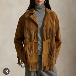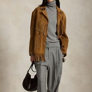 Elevate your style with this chic brown suede jacket featuring stylish fringe details. Perfect for adding a touch of flair to any outfit.