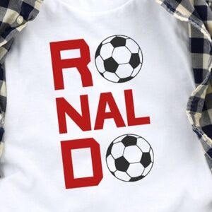 For the future football legend in your life! This youth soccer shirt features a bold "Ronaldo" design with both O's replaced by soccer balls—bringing sporty style and superstar energy to your child’s wardrobe. Whether they’re kicking it on the field or cheering from the sidelines, this tee is perfect for young fans who dream big and play hard.
