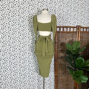 NEW Majorelle | Revolve Darla Olive Green Cut Out Tie Ruched Long Puff Sleeve Tight Sexy Designer Midi Dress XXS