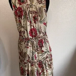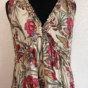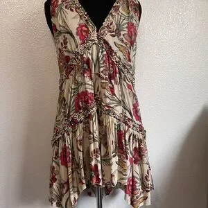 Free People Purple Haze Tunic Floral and humming bird print Bohemian style Tiered layers with ruffled trim High-low hemline V-neck Neutral colors, tan, red, green